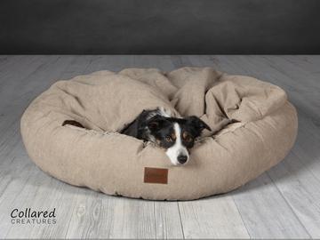 The Collared Creatures Classic comfort cocoon dog cave bed In beige Is great for snuggling and super pleasing on the eye. It is perfect For those dogs who snuggle, pinch blankets, sneak into bed and hijack the sofa.