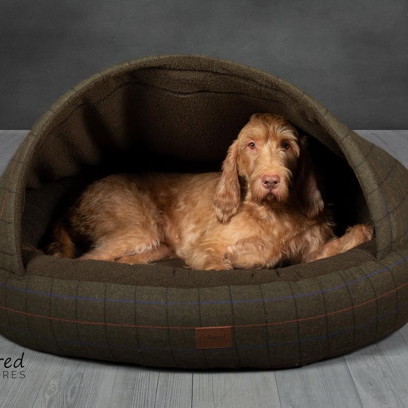 The Deluxe Cocoon Cave Bed is known for it’s a thick tubular bolster pillow that creates a ring of supported comfort to engulf our dog in a blissful comfort giving them their very own sanctuary. This bed has had every component handpicked to provide you with the best quality fabrics and inserts. The Outer is a green wool mix that creates a hard-wearing hood while still looking attractive. The Internal of the Cocoon Cave Bed is lined with a luxury Fleece Fabric, soft to touch but made to last.